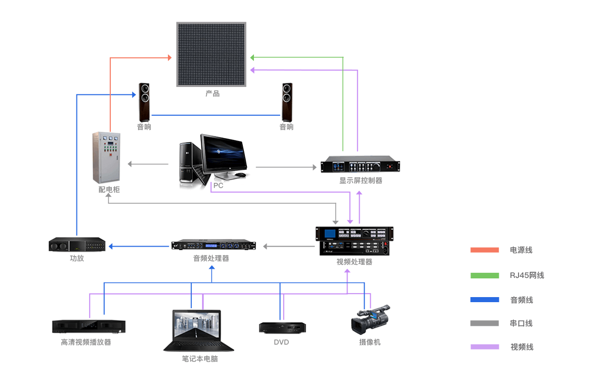 以多屏處理器為中心,周邊連接LED顯示設備、視頻信號源、音頻信號源、播控設備、環境控制、操作終端,集中對周邊信號控制、環境集控、統一部署、方便控制。用一套軟件系統、一套硬件系統就可以完成復雜、繁重的設置、控制、操作任務。